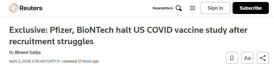 Recruitment struggles? That’s putting it mildly. Over 80% of people who showed even slight interest failed pre-screening. The companies admitted they couldn’t generate the “relevant post-marketing data” they needed. No safety issues, they claim, just nobody showing up for another round of the jab even if you’re paying them.