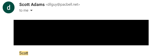 Over twenty-five years ago, I became a big fan of Scott Adams. I followed his work from the earliest Dilbert strips that captured the quiet madness of corporate life with such precision it felt almost personal. Long before his name became a lightning rod or his health a daily dispatch, I sent him an email. I never expected a reply. A man that busy, I thought, wouldn’t sift through the inbox clutter from strangers. To my quiet surprise, he answered with three plain words: “I read them.” A few more messages followed, brief and unpretentious. Back then he was still on pacbell (Pacific Bell), a telephone company in California which later merged and became a part of AT&T.