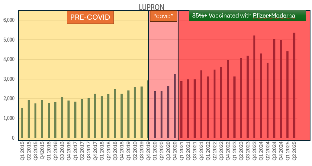 Here is the sales of Lupron (in doses) for Singapore from 2015-2025. If you simply eyeball it, you can see steady small increases in pre-covid years from 2015 to 2019 and after the population was subjected to the experimental therapy, the drug usage became more volatile.
