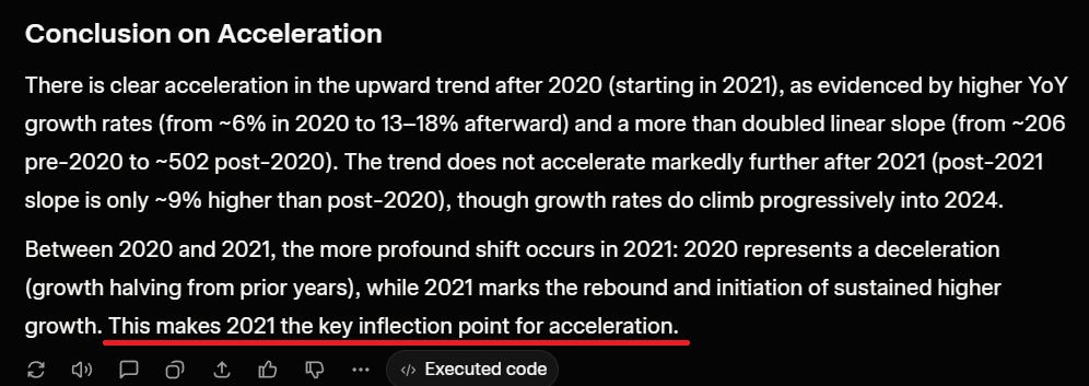 I dumped the raw data into Grok for analysis and here is the conclusion. It says 2021 is the key inflection point for acceleration. One has to wonder what happened in 2021.