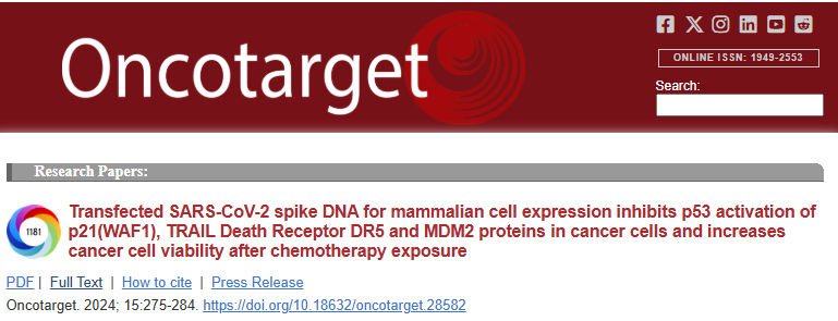 El-Deiry-led (2024): “Transfected SARS-CoV-2 spike DNA for mammalian cell expression inhibits p53 activation of p21(WAF1), TRAIL Death Receptor DR5 and MDM2 proteins in cancer cells and increases cancer cell viability after chemotherapy exposure”. In plain terms: Vaccine-mimicking spike DNA infiltrates cells, cripples p53 (the “guardian of the genome” that detects damage and triggers cell suicide), blocks TRAIL death pathways, boosts MDM2 (p53 destroyer), and protects tumors from chemo, tested in human cancer lines, explaining observed “turbo cancers” that surge aggressively post-vaccination/boosters.