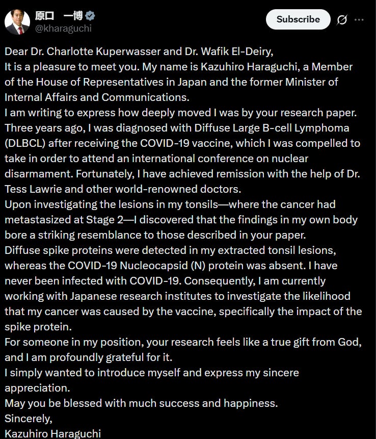 In a stunning tweet directed to to Drs. Wafik El-Deiry and Charlotte Kuperwasser, he detailed his harrowing ordeal: compelled to take the mRNA COVID vaccine to attend a global nuclear disarmament conference, he was diagnosed three years ago with aggressive Diffuse Large B-cell Lymphoma (DLBCL), spreading to his tonsils at Stage 2. Never infected with COVID, he achieved remission with help from renowned doctors like Dr. Tess Lawrie. This story is explosive, a high-ranking official, once at the heart of Japan’s government, now exposing vaccine risks amid rising global reports of post-shot cancers. Japanese research institutes tested his extracted tonsil tissues, detecting diffuse spike proteins (vaccine-induced) but no nucleocapsid proteins (virus markers), confirming the shot, not the virus, as the trigger.