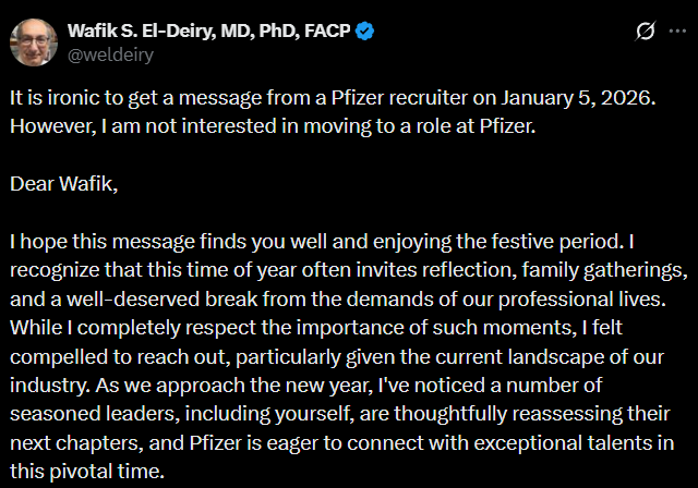 The situation grows stranger. Days after the paper was published, Pfizer reached out to recruit El-Deiry. A headhunter praised his expertise in oncologic sciences, highlighted his leadership roles, and floated senior positions at the company. El-Deiry shared the full message publicly and rejected it outright: “It is ironic to get a message from a Pfizer recruiter on January 5, 2026. However, I am not interested in moving to a role at Pfizer.”