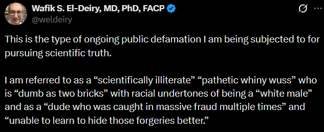 Dr. Wafik El-Deiry, addressed the backlash head-on. He described the personal attacks he faces for putting the work out there. “This is the type of ongoing public defamation I am being subjected to for pursuing scientific truth,” he wrote. He listed the slurs: “scientifically illiterate,” “pathetic whiny wuss,” even racial attacks and false fraud claims.