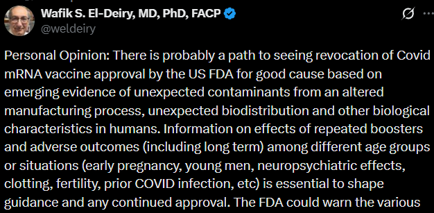 Congratulations to Dr. Wafik El-Deiry for standing firm in the face of intense pressure, smears, and a lucrative offer that could have silenced him. In an era where integrity is rare and costly, his public rejection of the Pfizer outreach and continued defense of open scientific debate show true commitment to truth over convenience, exactly what medicine needs more of right now.