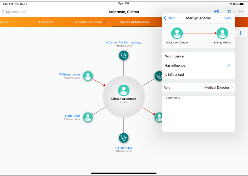 Here, the doctor named Clinton Ackerman is shown at the center (not a real doctor, just a sample name and profile used for illustration, but the app interface and features are genuine). The map visually lays out his professional network: red arrows indicate directional influence (like “Has influence” over others), while lines connect him to affiliated colleagues, clinics, and roles. For instance, it shows links to Marilyn Adams (marked as having influence over him, with her role as Medical Director at “A Center For Dermatology”), Jason Williams, Alan Slade, and places like Hilltop Plaza. The system tracks details such as roles, affiliations, and custom notes, all to help sales reps figure out who to approach first to sway prescribing decisions.