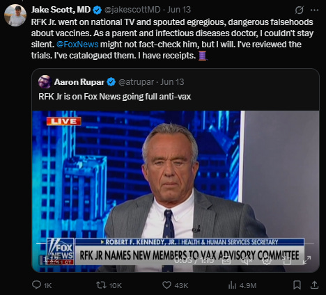 In this Senate hearing, Dr. Jake Scott, an infectious diseases expert from Stanford University, defended COVID vaccines (and vaccines in general). This is the same Dr. Jake Scott who has been loudly proclaiming his expertise as an infectious diseases doctor and supposedly “fact-checking” RFK Jr. on vaccine misinformation.